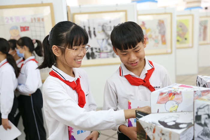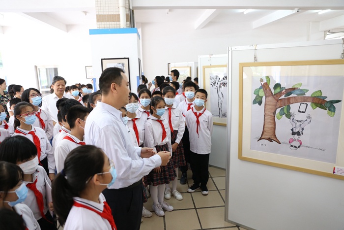 在開(kāi)幕式上,中山市婦女兒童活動(dòng)中心副主任陽(yáng)艷峰表示:舉辦漫畫比賽,同學(xué)們參與其中,在展覽中看到孩子放飛自我的想象力和橫涂豎抹的動(dòng)手能力,領(lǐng)略漫畫的魅力。小學(xué)部徐曙校長(zhǎng)對(duì)領(lǐng)導(dǎo)嘉賓們的到來(lái)表示熱烈歡迎并介紹了學(xué)校的“六個(gè)陪伴”培養(yǎng)目標(biāo),開(kāi)設(shè)幾十門選修課培養(yǎng)學(xué)生藝術(shù)愛(ài)好,希望通過(guò)本次漫畫獲獎(jiǎng)作品巡展能激勵(lì)更多的同學(xué)加入到漫畫創(chuàng)作中來(lái)。學(xué)生代表吳美林表示:“很高興認(rèn)識(shí)到幽默諷刺漫畫的表現(xiàn)方法和內(nèi)涵,漫畫創(chuàng)作的種子和中山優(yōu)秀漫畫文化的作品讓自己獲益良多,希望漫畫比賽活動(dòng)每年都舉辦!”