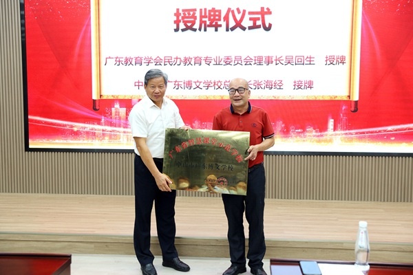 隨后是隆重的授牌儀式。吳回生理事長授予博文學校“廣東省智慧課堂示范學校”牌匾,博文學校校長張海經鄭重接過牌匾并予以由衷感謝。