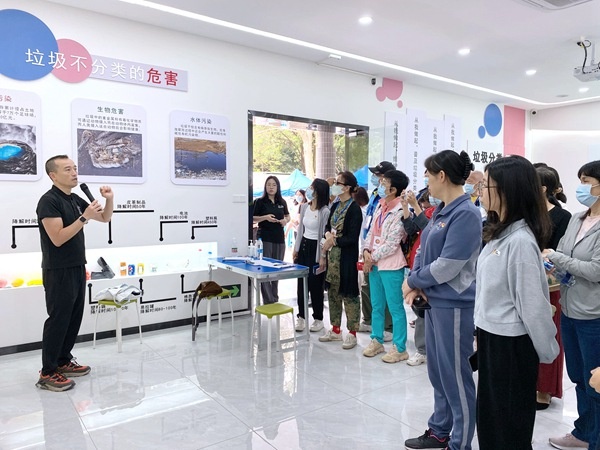 隨后,活動人員到達位于孫文公園北門的中山市垃圾分類時尚館進行參觀學習,講解員為大家普及了垃圾分類日常小知識及垃圾分類的重要性,倡議大家實現垃圾資源化利用,更好地保護環境。在講到“把廚余垃圾、園林垃圾綜合利用”的時候,講解員還特意運用現場設施設備進行堆田處理實操,讓大家直觀感受廚余利用的益處,黨員們認真聽講、充分互動,收獲頗豐。