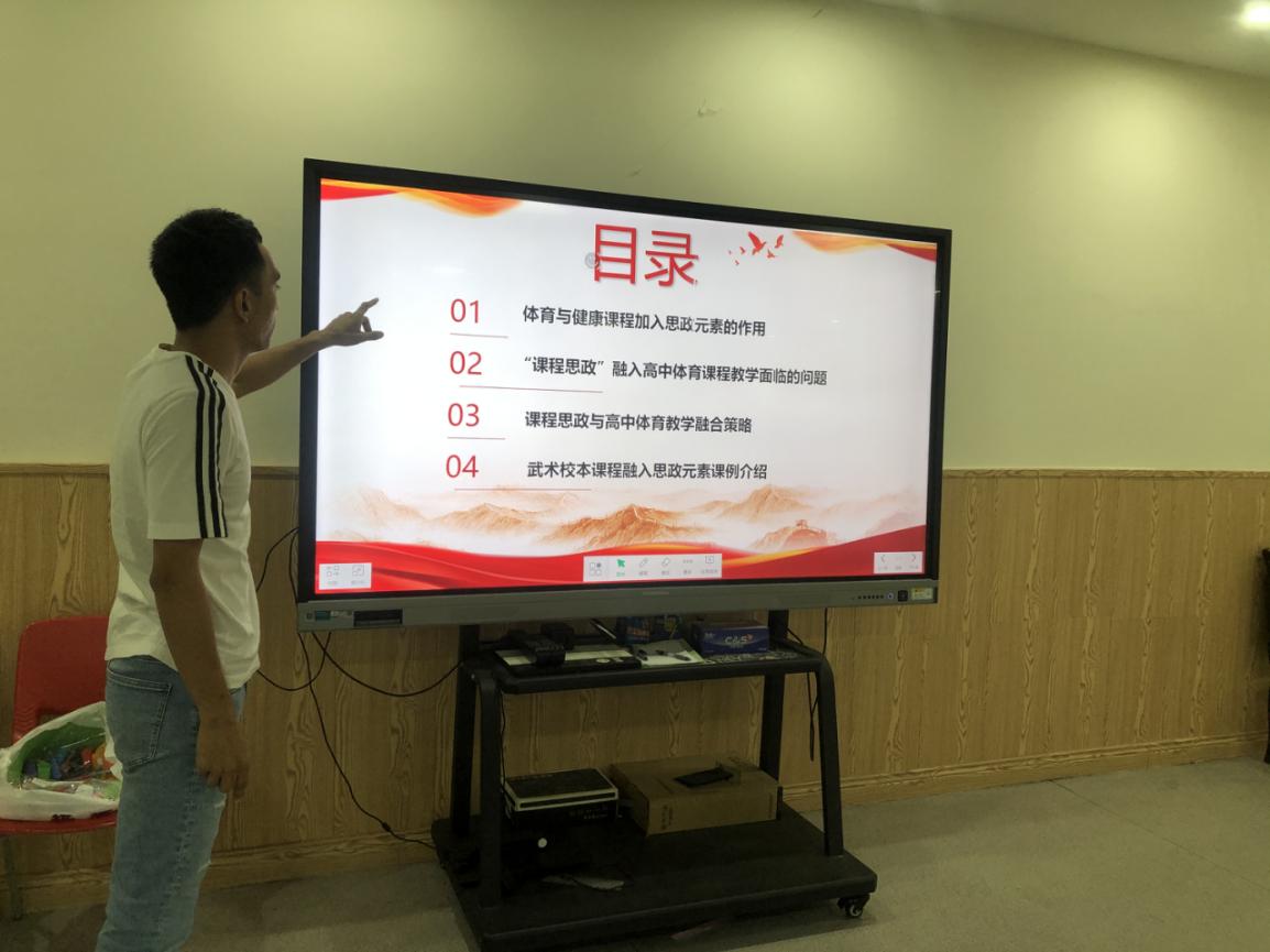 這次講座由楊兆恒老師主講。楊兆恒老師分別從體育與健康課程加入思政元素的作用、“課程思政”融入高中體育課程教學面臨的問題、課程思政與高中體育教學融合策略、武術校本課程融入思政元素課例介紹4個方面進行講解和分享。他認為課程思政理念融入高中體育課程教學中對促進學生身心健康、推動健康中國建設、培養擔當民族復興大任的時代新人,具有不可替代的重要作用。要借助體育文化滲透思想政治教育,在體育競賽中培養學生集體主義意識,借助集體項目培養學生團隊精神,在體育課程中滲透愛國主義教育,使高中體育教學與思想政治教育有機融合,課程思政理念融入高中體育課程教學。