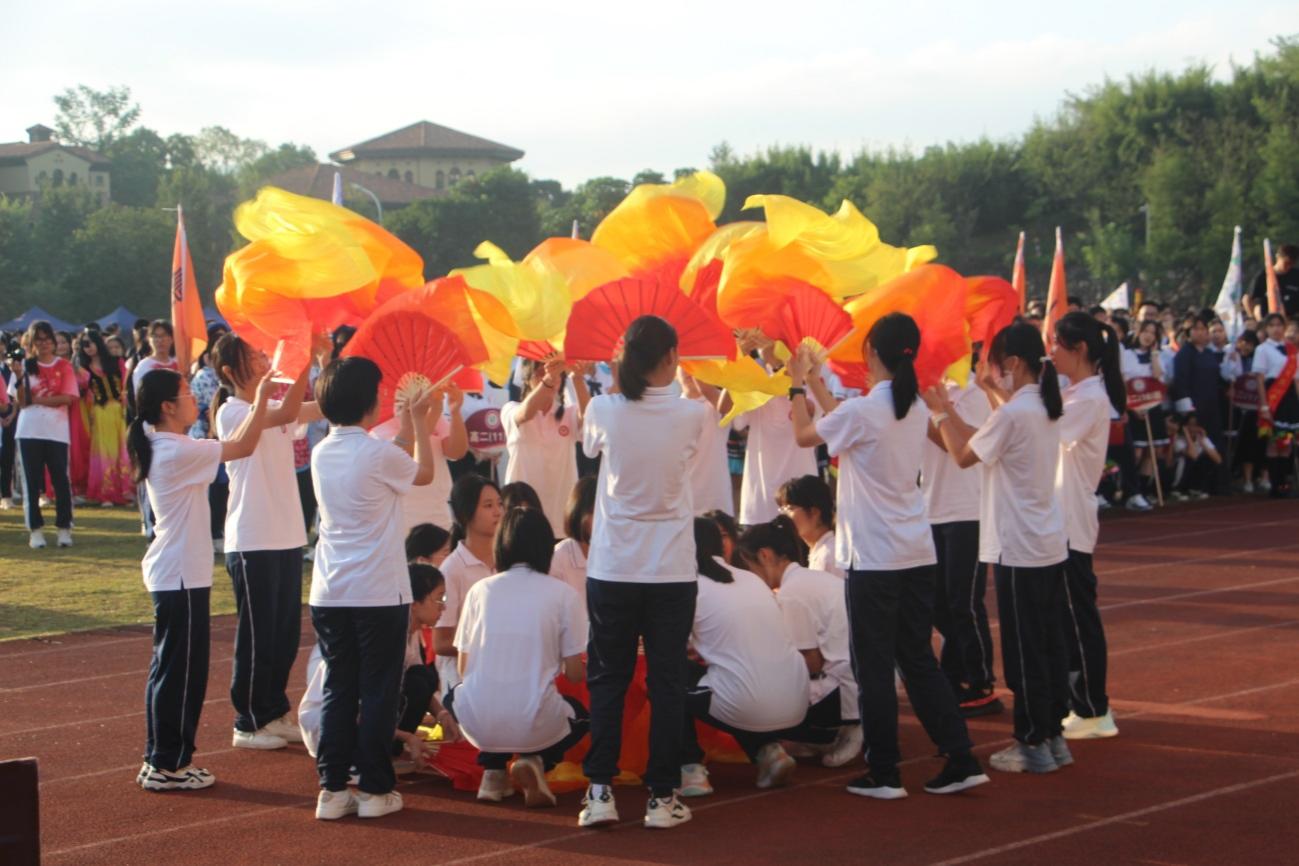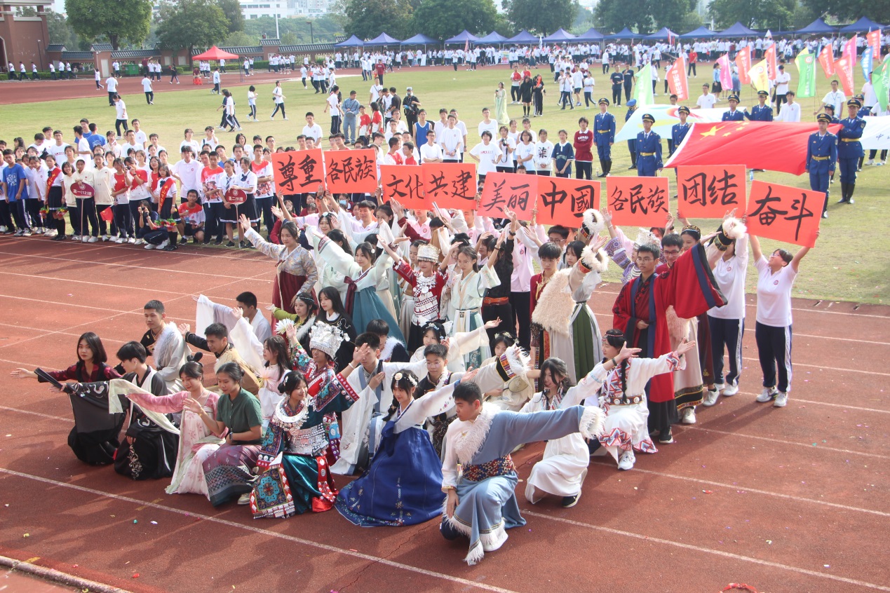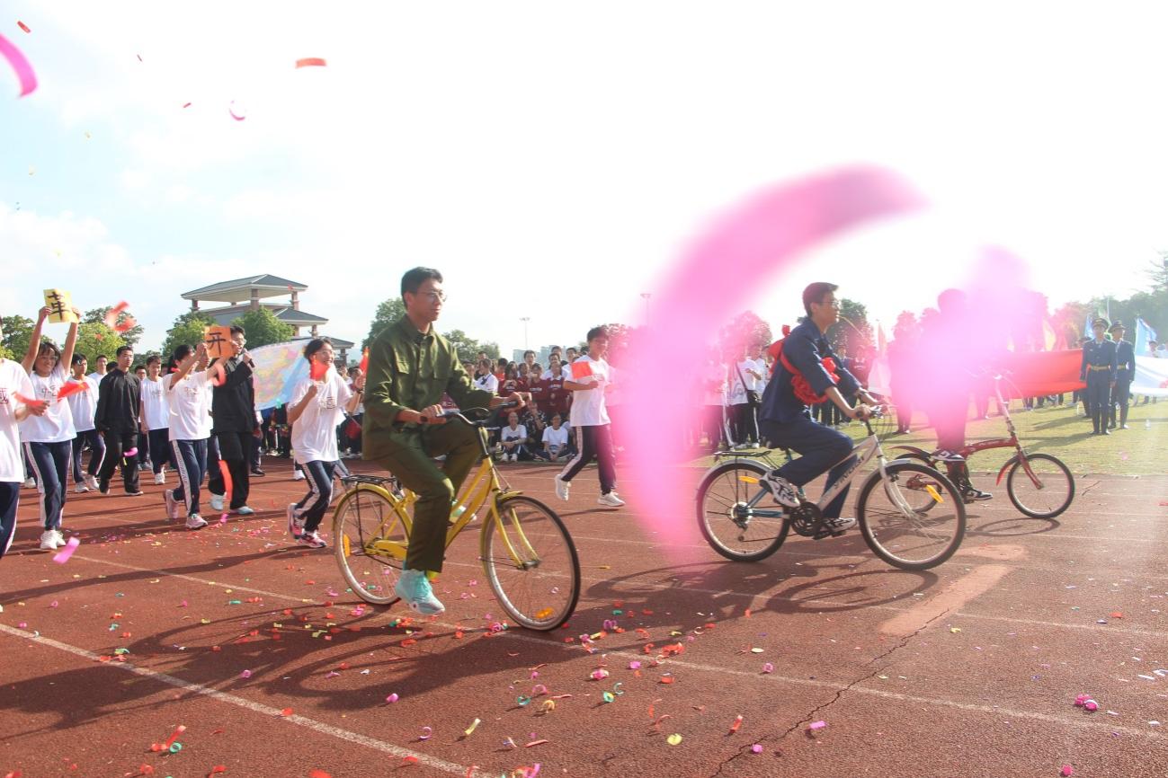 在秋日的艷陽里,桂山田徑場鑼鼓喧天、彩旗飄揚。60個班級,60個方陣,各班同學(xué)用自己的方式展現(xiàn)民族特色、時代精神、中國自信,用自己的信念詮釋新時代青年的責(zé)任與擔(dān)當(dāng)。高三(5)班學(xué)生穿著復(fù)古服裝,騎著自行車,展現(xiàn)改革開放前后的不同變化。高三(17)呈現(xiàn)了農(nóng)業(yè)直播現(xiàn)象,展現(xiàn)了鄉(xiāng)村振興的繁榮景象。高二(13)班跳著不同民族的舞蹈,生動呈現(xiàn)各民族一家親的畫面。在這里,你可以看到颯爽的舞蹈、風(fēng)趣幽默的表演以及多姿多彩的造型。