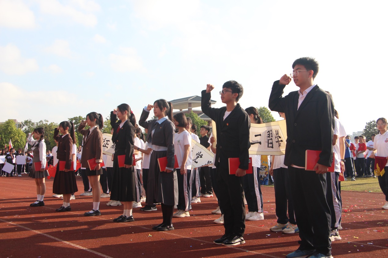 桂山中學(xué)陳福生副校長為運動會致開幕詞,并代表學(xué)校向參與運動會籌備、組織、保障的體育老師和其他所有工作人員表示感謝。他強調(diào),黨的二十大報告提出要促進群眾體育和競技體育全面發(fā)展,加快建設(shè)體育強國。學(xué)校體育是落實“立德樹人”根本任務(wù)的重要工作,是促進學(xué)生全面發(fā)展的重要工作。我們要以飽滿的精神狀態(tài),在賽場上勇敢的將自己的特長展現(xiàn)出來,不論面臨怎么樣的困境和難處,都要有自強不息、敢于拼搏、向前沖刺的勇氣。在大會中鍛煉自己的品格,強化自身的精神,養(yǎng)成榮辱不驚、泰然自若的大賽選手心態(tài),將自己的能力正常甚至超常地發(fā)揮出來,讓青春不留遺憾。隨后,體育老師付愛錦與學(xué)生黃嘉欣分別進行賽前宣誓,他們表示要恪守賽事活動安排,遵守比賽規(guī)則,嚴(yán)守賽場紀(jì)律,以積極飽滿的熱情、認真嚴(yán)肅的態(tài)度參與到運動會中。嚴(yán)小堅副校長為入場式中獲得一等獎的班級頒獎。