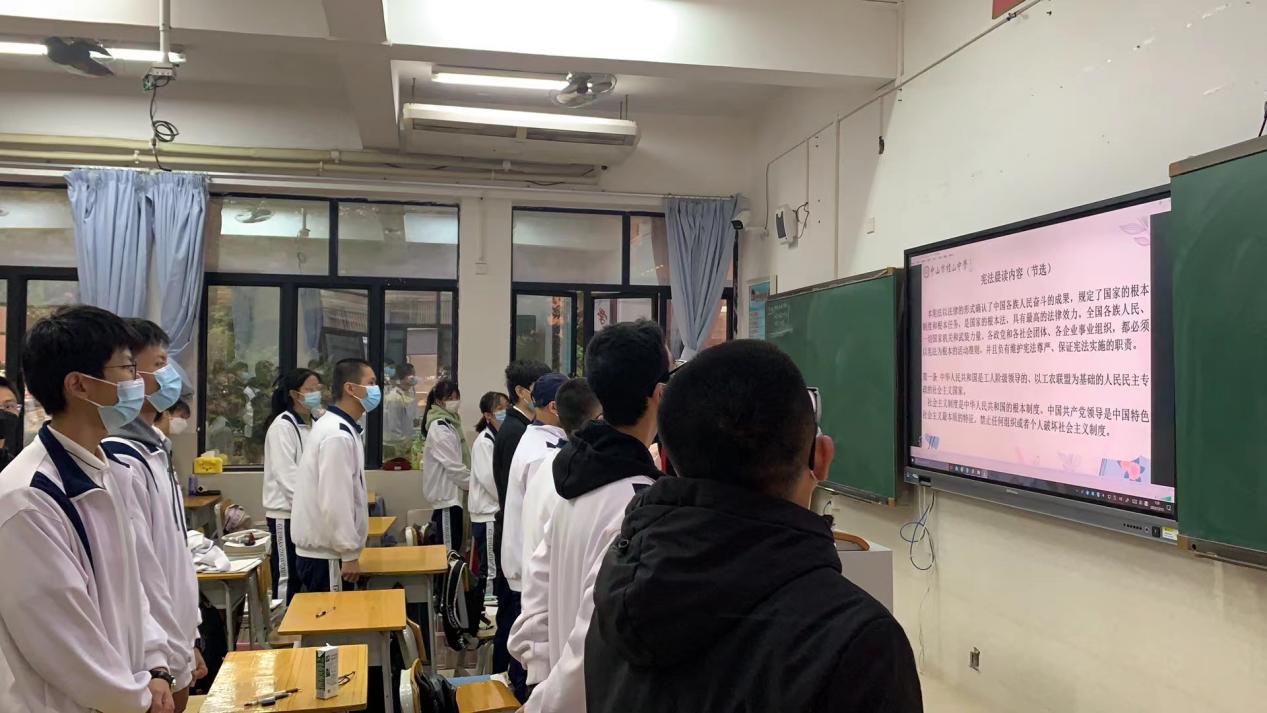 回顧歷史,改革開放以來黨和國家事業取得的歷史性成就和進步,都離不開憲法的全面有效實施,離不開全社會對憲法精神的尊崇。桂山師生會學習憲法、尊崇憲法,大力弘揚憲法精神,為全面推進依法治國貢獻力量。據悉,桂山中學為了開展好本次活動,制定了細致的活動方案。通過校園電視臺直播的形式,全校老師與學生一起參與憲法晨讀活動。所有人精神飽滿、情緒激昂,大聲跟隨誦讀,用心體會憲法的莊嚴與神圣,不僅溫習了憲法知識,更展現了學校師生良好的精神風貌。