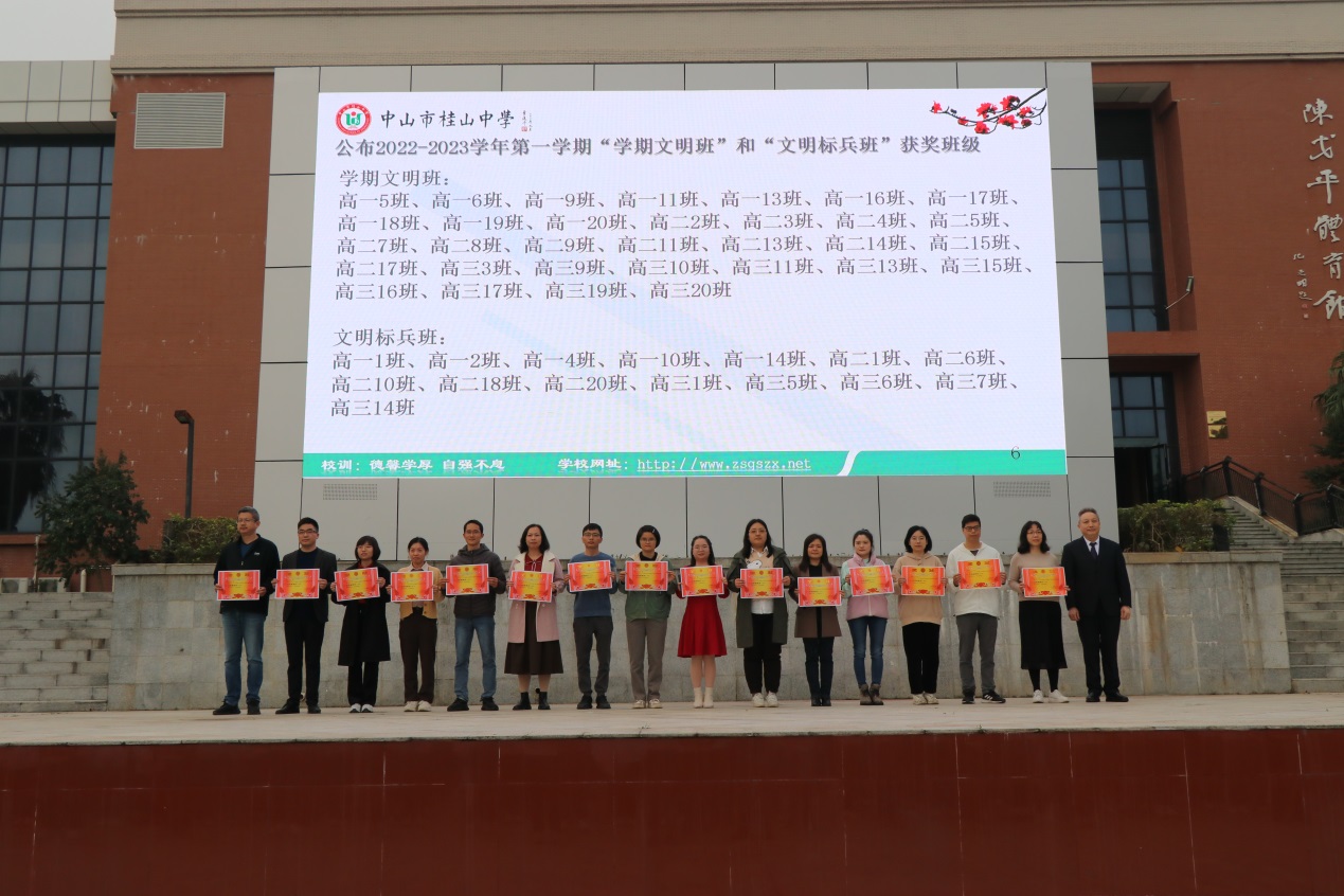 開學典禮上,學校還為2022-2023學年第一學期“學期文明班”和“文明標兵班”獲獎班級舉行了簡單的頒獎儀式。上學期共有32個班級榮獲“學期文明班”,15個班級榮獲“文明標兵班”,董再明校長、陳福生副校長、朱運安副校長為獲獎班級及班主任頒發獎狀和榮譽證書,鼓勵他們發揚桂山傳統,營造和諧的班級氛圍、校園環境,建設更加優秀的班級。