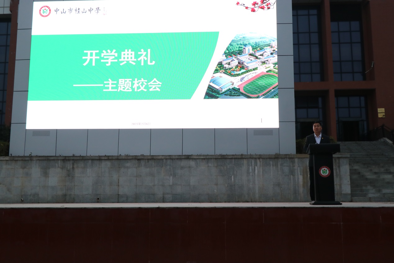 伴隨莊重而嚴肅的升旗儀式,開學典禮拉開帷幕。主持人劉浩主任熱烈歡迎全體老師和同學返校工作學習,開啟新的征程。桂山中學董再明校長發表《風好正揚帆,奮斗正當時》的主題講話,希望同學們能靜下心,沉浸在學習思考之中,享受進步的喜悅;能動起來,多運動,多參加社團活動,真正做到靜若處子、動若脫兔,在動靜相宜中,快樂成長。董校長表示,同學們身處千年不遇的偉大時代,建設現代化國家實現民族復興是主力之軍:在2035年,同學們正好30歲;在2050年,同學們正好45歲。“我們要與時代同頻共振,強大自己,報效國家。”