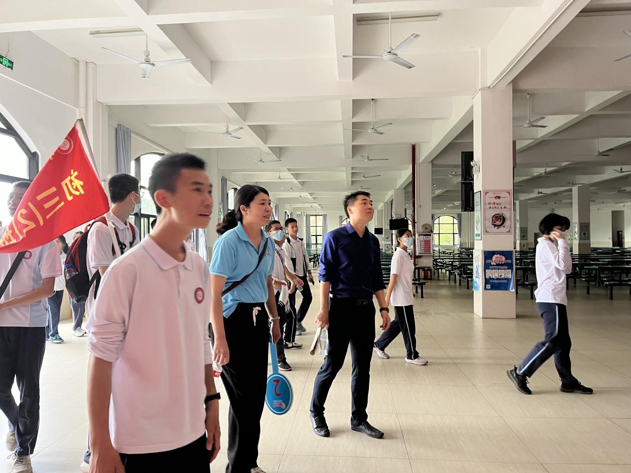 最后,同學們在劉浩主任的陪同下參觀了宿舍、飯堂等地,老師同學們紛紛拿出手機拍照,記錄下在桂山的參觀經歷。“我之前聽說桂山挺好的,沒想到來了之后發現桂山真的是非常不錯!校園公交專線能夠到達小欖,挺方便的。桂山的飯堂這么豐盛。”歐潤添校長代表小欖華僑中學感謝桂山中學的熱情接待。他說,桂山中學是一個各方面都很優秀的學校,值得我們學習,希望同學們確定了自己的目標,考上自己理想的學校。