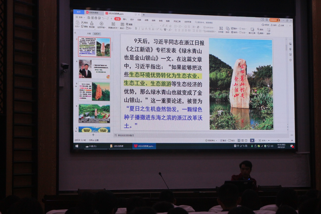 2023年3月5日,中山市桂山中學(xué)在德馨樓一樓會(huì)議室開(kāi)展第九期入團(tuán)積極分子暨第三期青馬班第五次授課。地理老師程子華為同學(xué)們上了一節(jié)關(guān)于環(huán)境保護(hù)的主題團(tuán)課。 程老師首先引入了環(huán)境保護(hù)的大背景。2005年8月15日,習(xí)近平在安吉縣天荒坪鎮(zhèn)余村考察時(shí)首次提出“綠水青山就是金山銀山”,情深意切地為一個(gè)小山村的發(fā)展把脈問(wèn)診,也為工業(yè)大省浙江的生態(tài)省建設(shè)登高望遠(yuǎn)。習(xí)近平同志在浙江日?qǐng)?bào)《之江新語(yǔ)》專欄發(fā)表《綠水青山也是金山銀山》一文。在這篇文章中,習(xí)近平指出:“如果能夠把這些生態(tài)環(huán)境優(yōu)勢(shì)轉(zhuǎn)化為生態(tài)農(nóng)業(yè)、生態(tài)工業(yè)、生態(tài)旅游等生態(tài)經(jīng)濟(jì)的優(yōu)勢(shì),那么綠水青山也就變成了金山銀山。”這一重要論述,被譽(yù)為“夏日之生機(jī)盎然勃發(fā),一顆綠色種子播撒進(jìn)東海之濱的浙江改革沃土。”