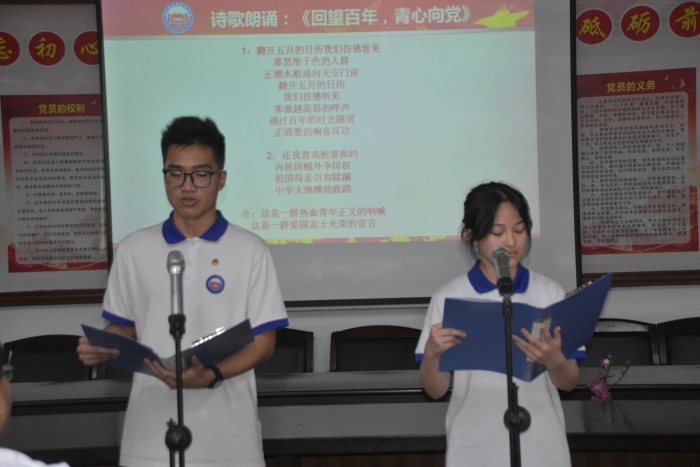 2022年新團員入團儀式正式結束后,團員代表高二6班羅子謙、高一8班楊樂帶來詩歌朗誦《回望百年,青心向黨》,表達了對“五四”運動的深刻紀念。