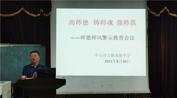 譚杰玉副校長(zhǎng)以“尚師德,鑄師魂,強(qiáng)師范”為題進(jìn)行師德師風(fēng)警示教育,他領(lǐng)學(xué)解讀了《新時(shí)代中小學(xué)教師職業(yè)行為十項(xiàng)準(zhǔn)則》《中山市中小學(xué)有償補(bǔ)課和教師違規(guī)收受禮品禮金問(wèn)題專(zhuān)項(xiàng)整治實(shí)施方案》《中山市師德師風(fēng)建設(shè)三年行動(dòng)計(jì)劃》等相關(guān)文件精神,要求全體教師要提高自身修養(yǎng),弘揚(yáng)新風(fēng)正氣,落實(shí)為黨育人、為國(guó)育才的根本任務(wù)。