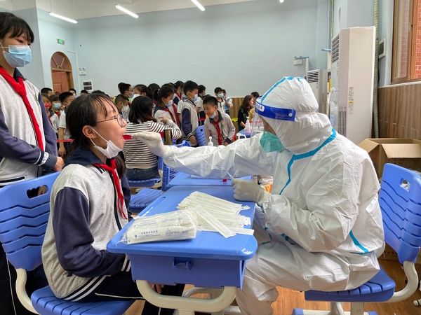 全體教師各盡其職,組織紀(jì)律、引領(lǐng)學(xué)生,確保每一位學(xué)生都能快速、有序完成檢測。核酸檢測現(xiàn)場,確認(rèn)學(xué)生信息后,醫(yī)護(hù)人員通過咽拭子方式,采集樣本。醫(yī)護(hù)人員全副“武裝”,本著高標(biāo)準(zhǔn)嚴(yán)要求的標(biāo)準(zhǔn)要求進(jìn)行核酸檢測。