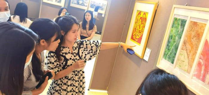 展廳內,在劉老師的個人作品《是自然的饋贈》前,同時也駐足許多前來交流的各校教師,各校之間關于專業技法與少兒版畫教學的探討,使這次的聯展交流氛圍愈加濃烈。