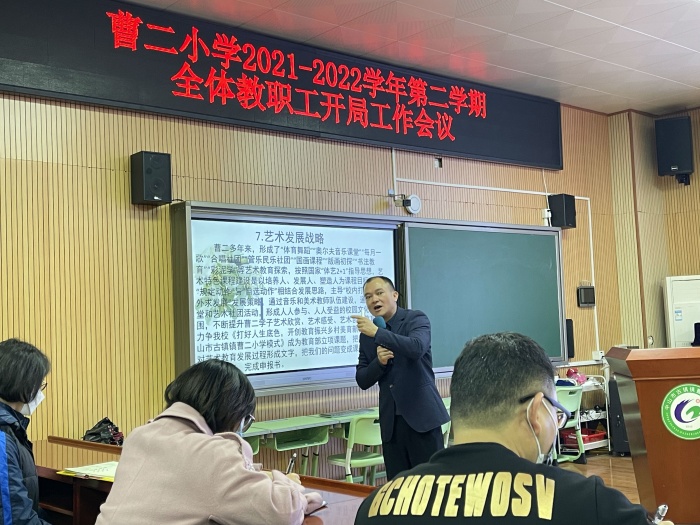 會議的第三項議程,邱波校長向全體教職員工展示了曹二小學校園文化建設方案,指出未來幾年的辦學理念,并詳細介紹了曹二小學的六大工作方向和七大發展戰略。最后,邱校長對學校新學期教學工作提出要求,表示對曹二小學打造體藝特色學校寄予厚望。希望全體老師明確自身的職責,以踏實勤勉的工作態度共同堅守好自己的崗位,精誠合作、互學互促,聚焦課堂、提質增效,為學校教育教學工作再上臺階貢獻力量。