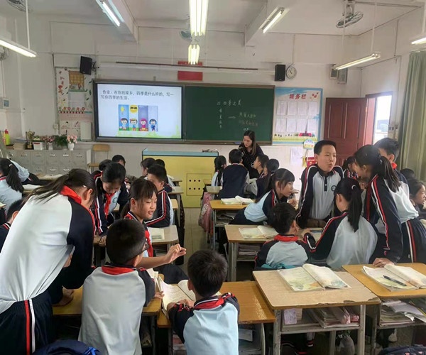 劉亞萍老師在五(4)班展示的是五年級《四季之美》課例,劉老師利用微視頻讓學(xué)生在正確、流利地朗讀課文的基礎(chǔ)上用自己喜歡的方式去讀,隨即劉老師讓學(xué)生在小組內(nèi)交流自己的閱讀所得,互相補(bǔ)充,互相借鑒,最后劉老師還用希沃白板中的蒙層技術(shù)引導(dǎo)學(xué)生有感情地朗讀課文,加深對課文內(nèi)容的理解,讓學(xué)生在充分的朗讀中感受四季的美。劉老師在本節(jié)課的最后對學(xué)生提出希望,生活中不缺少美,只是缺少發(fā)現(xiàn)美的眼睛,鼓勵(lì)孩子們用心生活,感受美好。