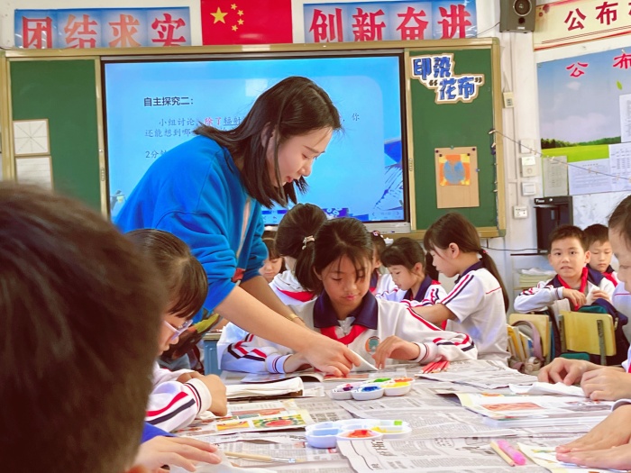 在課堂上,潘老師循循善誘。她引導著學生欣賞傳統印染工藝作品,感受印染工藝作品的對稱美與均衡美,通過了解傳統藍印花布的制作方法,樹立民族自信。學生在合作探究中學習十字折、輻射折、平行折等折疊方法,并嘗試創作出新的折疊方法;學習用點染、浸染等染色方法,創作出一副印染作品,裝飾課室,體驗印染工藝的制作樂趣,提升孩子們的自信心。