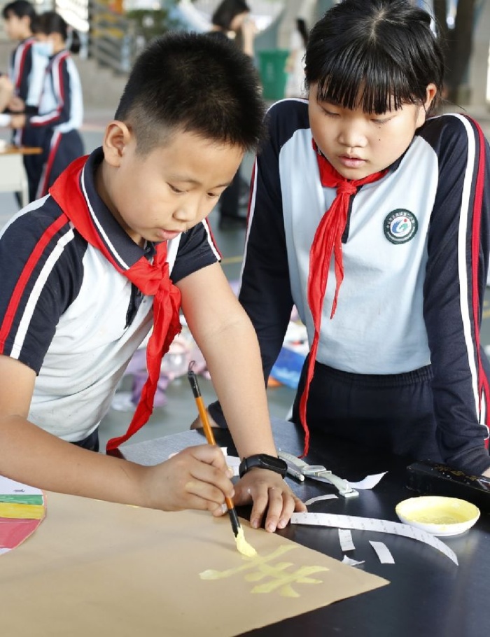 在活動開展前,美術老師先在各班開展小稿創作初賽評比并在班級擇優選出6名學生代表班級比賽。比賽當天,每班6名參賽選手現場合作繪畫出一幅全開尺寸的畫。美術科組長黎夢春老師在比賽前告知本次比賽要求并強調了創作內容及構思方向。曹二小學校長邱波宣布比賽活動開始。