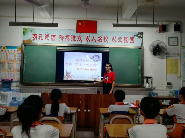 接著,由全體班主任組織同學(xué)們開展了以“厲行節(jié)約,守護(hù)‘舌尖上文明’”為主題的班會(huì)活動(dòng)。班會(huì)課上,同學(xué)們通過圖片了解了中國(guó)式盛“宴”以及飯?zhí)镁筒屠速M(fèi)的不良現(xiàn)象,從而引發(fā)了同學(xué)們對(duì)浪費(fèi)糧食的思考。糧食對(duì)于世界各地的貧窮人家來說是非常重要的,老師們通過一組觸目驚心的數(shù)字告誡同學(xué)們每年因?yàn)轲囸I而失去生命的兒童人數(shù)是巨大的,讓同學(xué)們談?wù)勛约簩?duì)珍惜糧食的感想和行動(dòng)。班會(huì)課的最后,老師們鼓勵(lì)同學(xué)們以實(shí)際行動(dòng)參與“光盤行動(dòng)”,以勤儉而榮,以浪費(fèi)為恥,為建設(shè)文明、和諧的校園做出應(yīng)有的貢獻(xiàn)。
