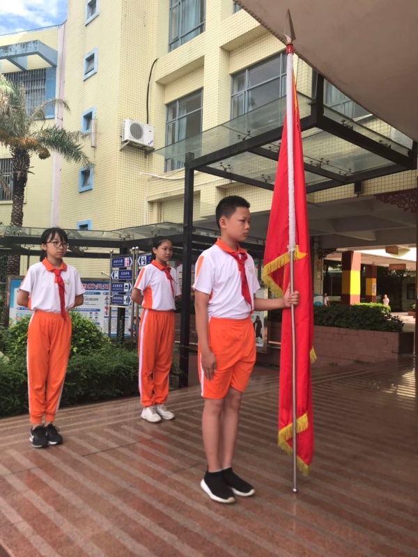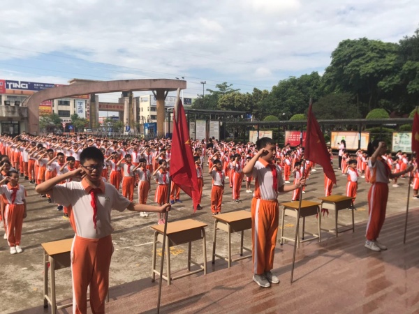 看!火紅的隊(duì)旗高高飄揚(yáng),指引我們前進(jìn)的方向。瞧!鮮艷的紅領(lǐng)巾系滿理想,載著同學(xué)們揚(yáng)帆遠(yuǎn)航。聽!那莊嚴(yán)的呼號,像黎明的鐘聲,伴著少先隊(duì)員們茁壯成長。首先,同學(xué)們出旗,唱隊(duì)歌,接著,大隊(duì)輔導(dǎo)員陳曉瑜老師宣布新隊(duì)員名單,然后,老隊(duì)員為一年級的新隊(duì)員佩戴紅領(lǐng)巾。看著孩子們胸前飄動的紅領(lǐng)巾,老師們感到無比的幸福和自豪,愿孩子們胸前的紅領(lǐng)巾能時(shí)刻激勵(lì)著大家取得一個(gè)又一個(gè)進(jìn)步。在莊嚴(yán)的隊(duì)旗下,少先隊(duì)大隊(duì)長孫芷妍同學(xué)帶領(lǐng)全體少先隊(duì)員高舉右手,大聲宣誓。