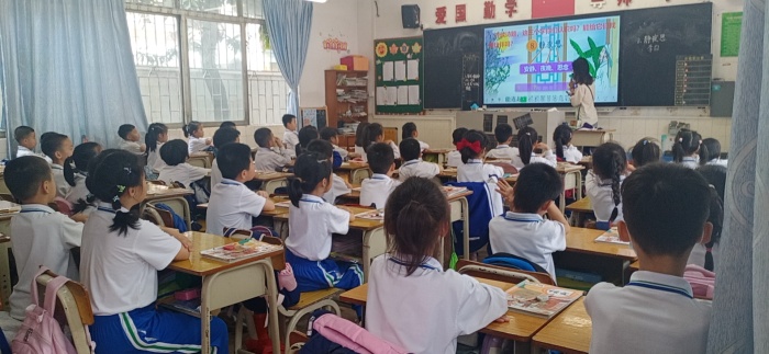 區穎珊老師以字謎激趣導入,進而引出課題《靜夜思》。隨后,區老師借用游戲和小組比拼,幫助孩子們快速地掌握詩歌的韻律節奏。同時運用希沃白板的學科工具來輔助學生理解“明月光”,讓學生在感受到月光的同時,又學會借助動作聯想畫面的學習方法。