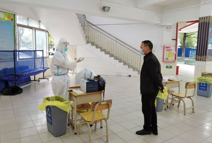 3月23日一大早,古鎮(zhèn)鎮(zhèn)人民醫(yī)院的白衣天使們穿著防護(hù)服走進(jìn)校園,教師志愿者們各就各位,為核酸檢測工作的開展做好準(zhǔn)備工作。