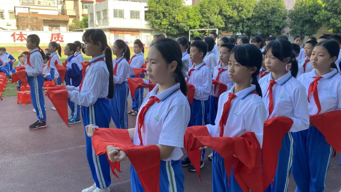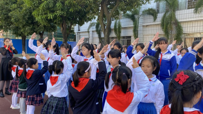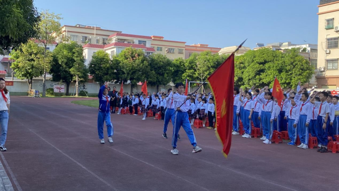 然后,在指揮員的帶領下,全體少先隊員齊聲高唱隊歌:“我們是共產主義接班人,繼承革命先輩的光榮傳統……”嘹亮的歌聲在校園內回蕩,傳遞著隊員們對少先隊的熱愛與崇敬。