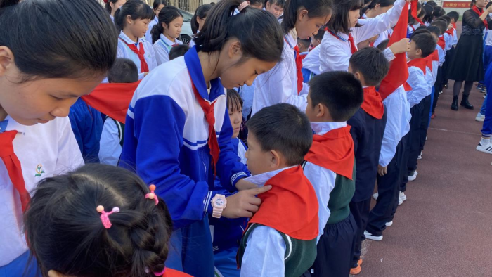 接著,大隊輔導員謝睿老師莊重的宣讀了組建一年級少先隊組織的決定及新隊員名單,一年級87名小學生被批準加入中國少年先鋒隊,正式成為光榮的中國少年先鋒隊隊員,六年級的老隊員們鄭重地為新隊員系上鮮艷的紅領巾,新隊員們回敬標準的隊禮。