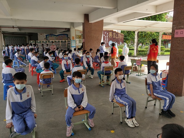 在學(xué)校廣播的指揮下,由高年級(jí)至低年級(jí)的順序,分時(shí)段依次錯(cuò)峰到達(dá)檢測(cè)點(diǎn)采樣,班主任負(fù)責(zé)帶隊(duì)到學(xué)校大堂檢測(cè)點(diǎn),按照事先收集好的葵花碼順序,十人一列縱隊(duì)為一小組,現(xiàn)場(chǎng)設(shè)置4條檢測(cè)通道,每條通道放置10個(gè)間隔1米的凳子。師生全程佩戴口罩,且保持一米距離,完成咽拭子采樣后通過(guò)指示出口方向有序離開,做到整個(gè)檢測(cè)流程井然有序。