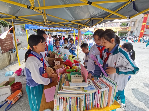 學生們不管是買的賣的都不亦樂乎,大家都心滿意足地拿著自己精心挑選到的物品,有的低價購買了喜愛的二手書籍,有的買到了心愛的玩具,有的通過游戲獲得了獎品……每個學生臉上都綻放出燦爛的笑容。