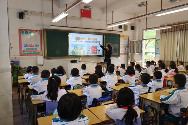 升旗儀式上,廖秋媚老師以《樹立法制觀念,自覺遵紀守法》為主題進行國旗下講話。廖老師首先號召新時代的青少年,在學好文化知識的同時,應豐富法律常識,健全法律知識,養成遵紀守法的良好習慣;其次建議同學們要從小事做起,懷有寬廣的胸懷,不因小事激化同學矛盾,搞好團結,愛護公物,保持校園環境的優美整潔,在學校做個好學生,在社會做個好公民。