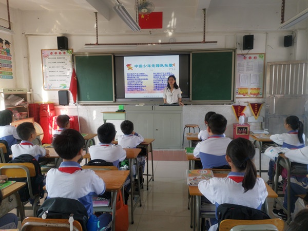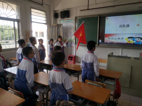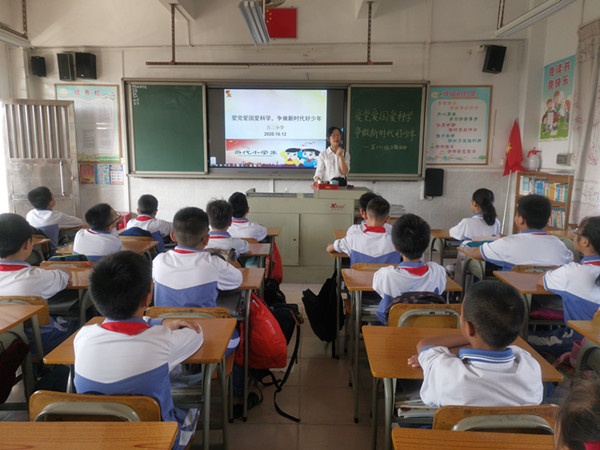 接著,中隊輔導員講述了燦爛輝煌的華夏文明,讓隊員個個心潮澎湃,民族自豪感頓時油然而生。回溯歷史長河,輔導員又帶大家回顧了祖國曾經遭受過的苦難。憶往昔崢嶸歲月稠,過去的屈辱不能遺忘,而如今的中國已經屹立于世界之巔,香港、澳門相繼回歸祖國懷抱、神舟七號成功著陸、北京奧運會成功舉辦,中國正在世界舞臺上展現自己的大國風范。隊員們在課堂上積極地討論著祖國的偉大科學成就,并在輔導員老師的引導下思考作為一名少先隊員如何踐行愛國思想。