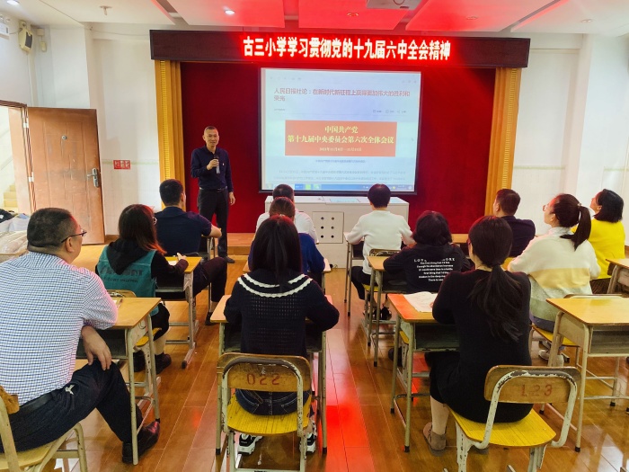 中國共產黨第十九屆中央委員會第六次全體會議于11月8日至11日在北京召開。古三小學全體黨員紛紛通過電視、電腦、手機、學習強國等媒介自主學習全會公報。11月15日上午古三小學召開“深悟百年成就 開創美好未來”——學習貫徹黨的十九屆六中全會精神專題學習會。