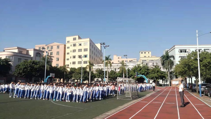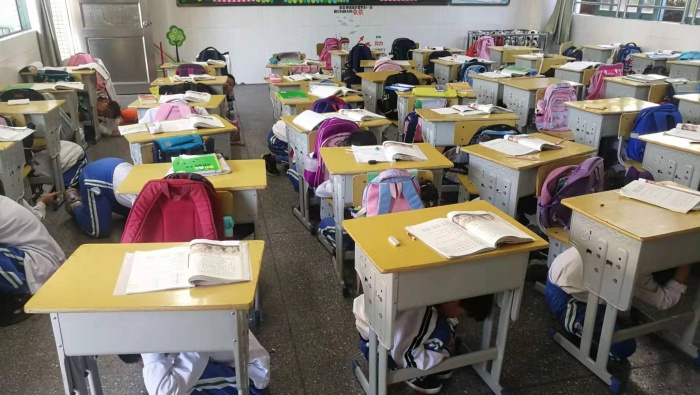 早上8點55分,演練正式開始,第一聲長的鳴笛聲表示地震發生,學生迅速蹲到桌子下面,用雙手保護頭部。第二次鳴笛聲響起,學生們迅速有序疏散到學校的操場上。學生撤離到安全地點后,各班體育委員及時整理隊伍,檢查男女生人數,報告班主任,班主任向年級組長報告,年級組長將情況報告總指揮。