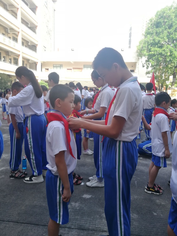 隨著雄壯高昂的旋律響起,同學們高唱《中國少年先鋒隊隊歌》,嘹亮的歌聲表達了同學們對隊組織的熱愛。緊接著,學校大隊輔導員彭款君老師宣讀了入隊名單,126名新隊員在歡快喜慶的音樂聲中,踏著整齊的步子、意氣風發地走上臺來,老隊員們鄭重地為新隊員系上鮮艷的紅領巾,新舊老隊員互敬隊禮。新隊員代表的講話,表達了全體新隊員的心聲:“我今天終于成為了一名光榮的少先隊員,帶上了鮮艷的紅領巾。紅領巾代表國旗的一角,是我們兒童節最神圣的禮物,我一定會好好愛護它。在今后的日子里,我一定團結同學,尊重老師,好好學習,不辜負父母對我的期望和少先隊員這個稱號。”最后,少先隊大隊輔導員彭款君老師帶領隊員們呼號,“時刻準備著!”這嘹亮的呼號,在操場上空飄蕩。