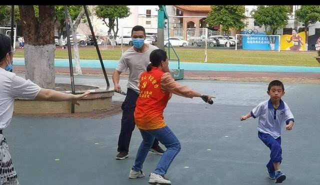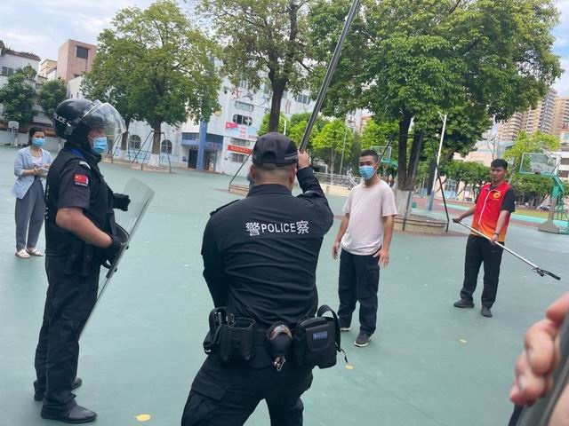 演練開始,學校模擬下午4:10學生如常下課,在操場上玩耍嬉戲,因保安員個人原因離開保安室忘記關上南門鐵閘門,有一滋擾者(為輕度精神病患者)突然闖入,神色兇兇,正向有學生的方向跑。保安員持械立即上前制止,與滋擾者對峙;另一名保安員立即按響一鍵報警系統向市110指揮中心報案及校園危險警報信號。