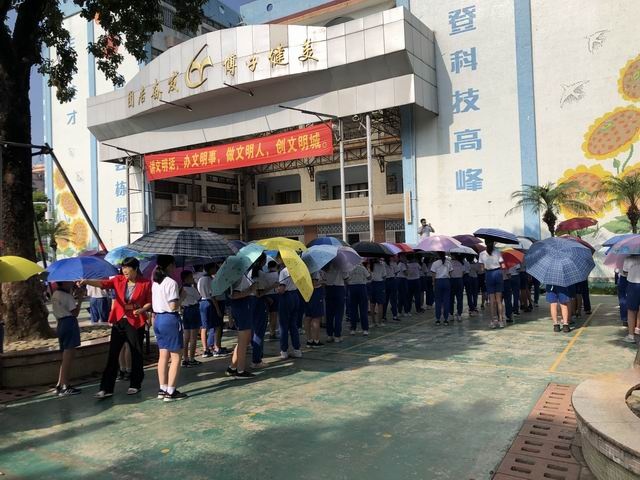 在一年級(jí)學(xué)生被家長(zhǎng)接走、有雨具的學(xué)生也已離開校園后,唐主任通過(guò)廣播通知其他沒(méi)雨具的學(xué)生列隊(duì)到一樓等候。全體行政和值日教師在各樓層和校門口指揮疏散,并且提醒學(xué)生注意安全,及時(shí)提供幫助等。