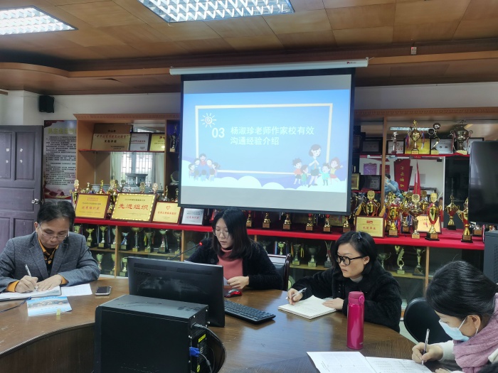 第一議程是由三位班主任進行經驗分享。先由王金星老師進行特色班級創建匯報。金星老師圖文并茂地向班主任們展示他創建特色班的歷程、班級特色成果和創建感受,他的展示,讓班主任們真真切切地感受到金星老師特色班創建工作的用心。接著由經驗豐富的袁秀歡老師進行早讀、午練、包干區管理經驗介紹,她把多年積攢的帶領班級的經驗向班主任們進行了詳細的講述,班主任們用心聆聽,時不時還不住地點頭認同。最后由新手班主任楊淑珍老師向班主任們進行家校溝通經驗交流,楊老師獨到的、新穎的教育管理方式讓班主們耳目一新,受益匪淺。