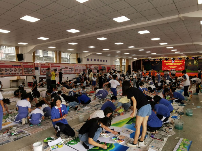 上午8:30,古鎮鎮美術教研中心組長李桂萍老師的一聲令下,參與活動的師生便整齊地蹲在畫布前,在潔白的百米畫布上盡情涂畫。這次繪畫以海洲第一小學(海洲國民小學)建校110周年華誕為主題,通過師生們的巧手,描繪海洲第一小學與海洲村的歷史。