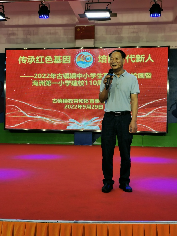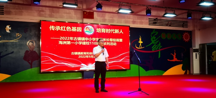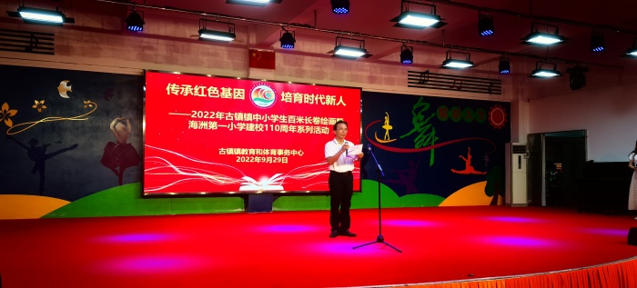 描百載春華,繪今朝蓬勃。2022年中山市古鎮鎮海洲第一小學迎來110周年校慶,2022年9月29日,在百年老校華誕之際,古鎮鎮海洲第一小學舉辦了“傳承紅色基因 培育時代新人”古鎮鎮中小學百米長卷繪畫活動。參加本次活動的有古鎮鎮教育和體育事務中心林梗卿副主任,古鎮鎮教育和體育事務中心孔國范干事,古鎮鎮書畫協會何錦垣會長以及各小學參與活動的師生。