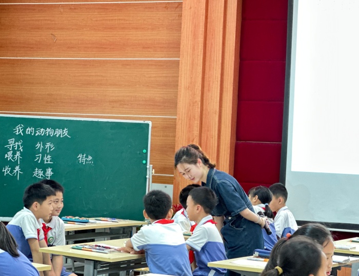 海洲第一小學甘泳琪老師在團隊的共同研磨下,展示四年級上冊第四單元習作課例《我的動物朋友》。甘泳琪老師在習作教學中先以單元習作例文切入,創設了三個情境,引導學生留心觀察小動物的外形、習性、趣事等特點,對典型事例進行具體的描寫。本次執教中,甘泳琪老師課堂教學中最大的亮點在于,當學生介紹情境中的動物朋友時,及時捕捉學生語言描述的生動性,強化學生的情感體現,從語言描述中捕捉體現親密關系、朋友情誼的詞或句,為后面的動筆做好鋪墊。