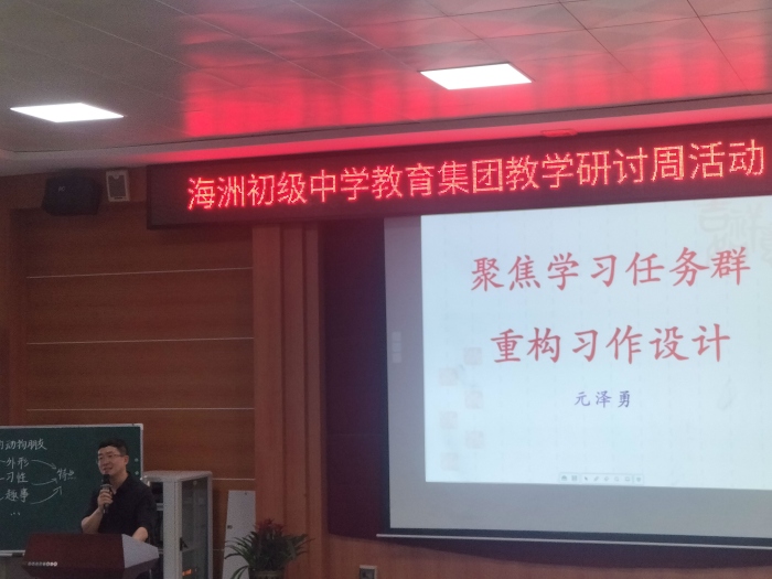 緊接著,鎮語文教研組長元澤勇主任帶來題為“聚焦學習任務群、重構習作設計”的講座。元老師從課例評價出發,對于在作文教學中如何設計任務群,如何引導學生言語實踐,作了一場精彩的講座。