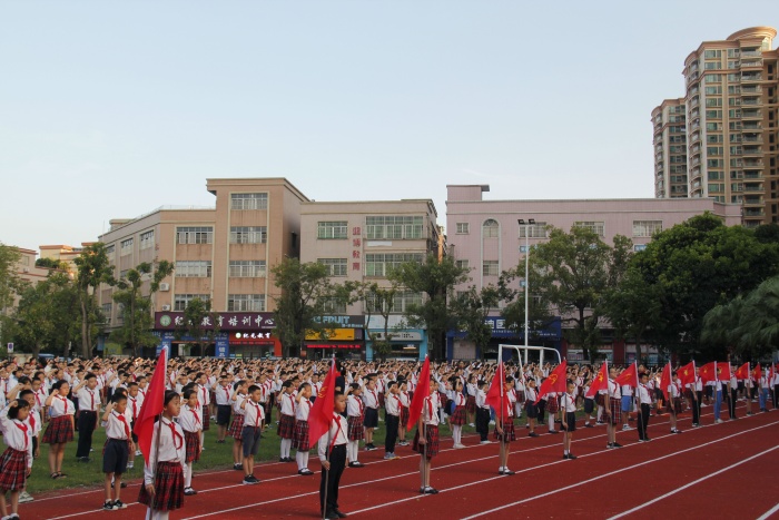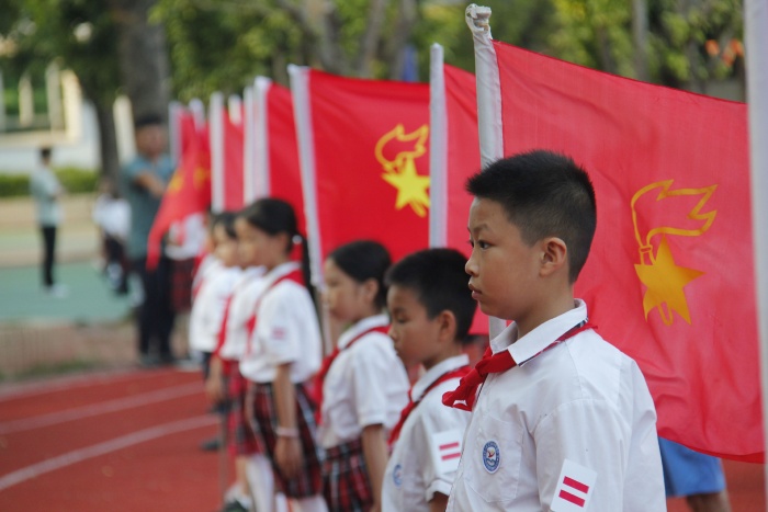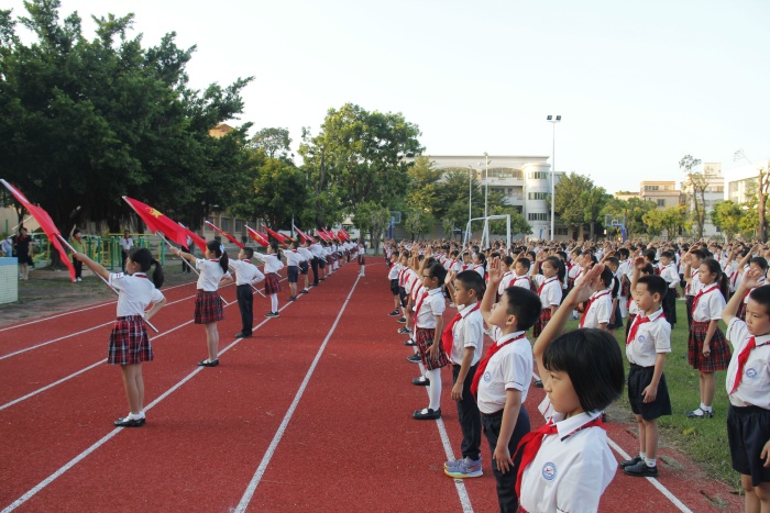 隨著主持人宣布活動開始,精神抖擻的旗手邁著堅定有力的步伐走過升旗臺,全體少先隊員向隊旗敬禮,整齊劃一的小手,在陽光的折射下,透露著堅定與崇敬,每一位少先隊員青春的面孔在鮮艷的紅領巾襯托下更加熱情洋溢。