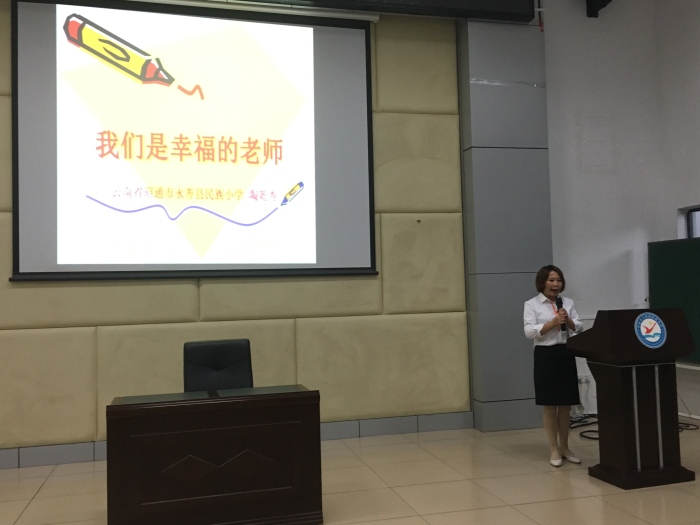 隨后,來自云南永善縣民族小學的陶乾秀老師以《我們是幸福的老師》為主題發表了講話。陶老師首先感謝了鎮南小學在這段時間的悉心照顧和熱情指導,在這將近一個月的學習過程中,她更加感受到做一個人民教師的使命與擔當,更加領略到做一個人民教師更要做到包容、堅持、創新與開拓,更加感覺到做一個人民教師的光榮、驕傲與幸福。接著陶老師分享了她三十年從教生涯中的點點滴滴,從一個個生動具體的事例中,教師們看到了陶老師的積極和樂觀,感受到了陶老師對學生的關心與熱愛,更深切地體會到陶老師對教師職業的驕傲與自豪。就如陶老師所言“我們所從事的職業是在創造世界,我們所收獲的是任何數字都無法計算的生命價值和幸福成果。”