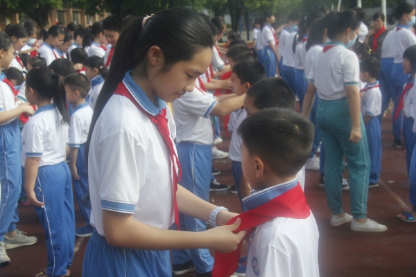 活動(dòng)開始,出旗手和護(hù)旗手邁著矯健的步伐,精神昂揚(yáng)地走過升旗臺(tái),在響亮的出旗曲中,儀式正式拉開了帷幕。出旗完畢,全體少先隊(duì)員精神飽滿,眼神堅(jiān)定,高唱齊唱《中國(guó)少年先鋒隊(duì)隊(duì)歌》。接著,由低年級(jí)大隊(duì)輔導(dǎo)員卞琦老師宣布新入隊(duì)的隊(duì)員名單,此次入隊(duì)每個(gè)班級(jí)選出了14名品學(xué)兼優(yōu)的好少年優(yōu)先入隊(duì),共計(jì)112名新隊(duì)員。所有新隊(duì)員們站得筆直,接受這份屬于自己的榮譽(yù)。接下來就是激動(dòng)人心的授紅領(lǐng)巾環(huán)節(jié)。六年級(jí)的老隊(duì)員們手捧鮮艷的紅領(lǐng)巾整齊地走到一年級(jí)的新隊(duì)員面前為新隊(duì)員們佩戴好紅領(lǐng)巾。在《紅領(lǐng)巾飄起來》的背景音樂中,老隊(duì)員和新隊(duì)員互敬隊(duì)禮,仿佛完成了一場(chǎng)使命的傳承。所有新隊(duì)員佩戴好紅領(lǐng)巾后,總輔導(dǎo)員劉姝鶯副主任帶領(lǐng)新隊(duì)員們進(jìn)行宣誓。在隊(duì)旗下,所有新隊(duì)員緊握右拳,莊嚴(yán)宣誓:為共產(chǎn)主義事業(yè)貢獻(xiàn)力量!宣誓完畢,由德育林德歡副校長(zhǎng)分別為所有新建立的中隊(duì)以及中隊(duì)輔導(dǎo)員授予隊(duì)旗和聘書。