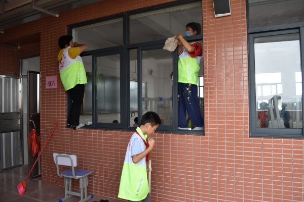 由于裝修工程遺留的灰塵較多,清潔任務(wù)繁重,雖是烈日當(dāng)空,仍然阻擋不了大家的熱情和腳步,每一個(gè)人都在自己的清潔區(qū)域內(nèi)恪盡職守,揮灑著勞動(dòng)的汗水。老師們、家長(zhǎng)們肩負(fù)起高難度工作,細(xì)心擦拭著高層窗戶,安裝教室窗簾,清潔帶有頑固污漬的死角。學(xué)生們勁頭十足,紛紛拿起自帶的抹布和掃把,二話不說開始干了起來。一雙雙小手將玻璃窗擦得明亮潔凈,把教室的桌椅擺放地整整齊齊,甚至不放過教室大門的每一處縫隙,那勞動(dòng)的熱情使得胸前的紅領(lǐng)巾更加鮮艷。
