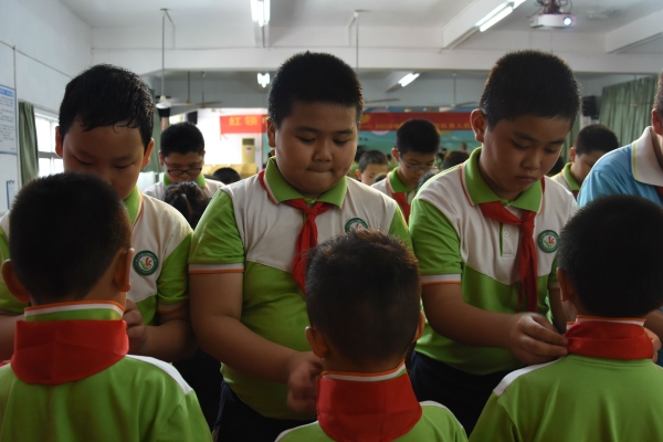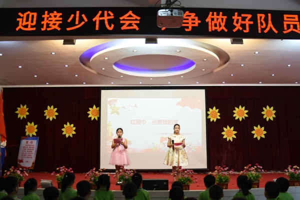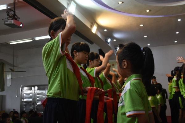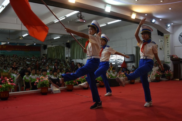 在雄壯有力的出旗曲中,少先隊入隊儀式由此拉開帷幕。接著,在大隊長的指揮下,全體隊員唱起了《中國少年先鋒隊隊歌》。嘹亮的隊歌歌聲剛落,主持人宣布了新隊員名單,五年級的老隊員們紛紛上前為新隊員佩戴紅領(lǐng)巾。優(yōu)秀少先隊員隨后也給中隊輔導(dǎo)員授紅領(lǐng)巾,大隊輔導(dǎo)員給中隊輔導(dǎo)員授中隊旗。當(dāng)新隊員們都戴上了鮮艷的紅領(lǐng)巾后,在該校大隊輔導(dǎo)員廖潔怡的帶領(lǐng)下,全體新隊員鄭重地舉起右拳,在鮮艷的隊旗下莊嚴(yán)宣誓,從此成為一名光榮的少先隊員……