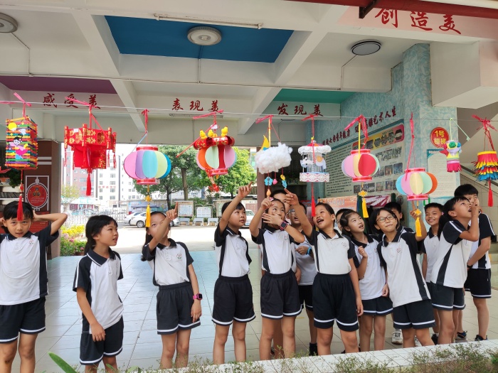 接著,三沙小學以年級為單位評選出近百個設計精巧、色彩繽紛、獨具匠心的燈籠作品。有的燈籠鮮艷熱忱,寄托濃濃的情思;有的燈籠古風溫婉,承載中秋佳節的祝福;有的燈籠實用精巧,暗含“變廢為寶”的巧思。它們懸掛在校園之中,學生們下課后就聚集在燈籠下,興奮地跟小伙伴介紹自己的燈籠,十分歡樂。
