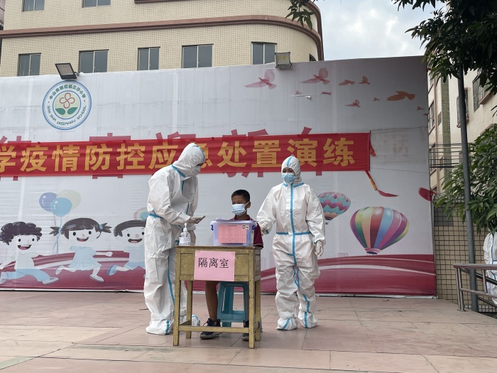 活動首先進行的是新冠肺炎疫情應急處置演練。演練以模擬情景為線索,按處置的先后順序,分為“前期處置階段、應急響應階段(學校內處置)、應急處置階段(相關部門到校處置)、學校做進程報告階段和應急響應終止階段”等五個流程。