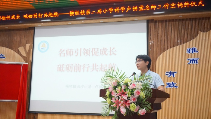 揭牌儀式上,王春明、李偉業(yè)、李余仙、歐慧芳、馮艷芳、盧福棠共同為橫欄鎮(zhèn)第三屆小學(xué)科學(xué)盧福棠名師工作室揭牌。李偉業(yè)為工作室成員頒發(fā)聘書(shū)。四沙小學(xué)歐慧芳校長(zhǎng)致歡迎辭,表示將全力支持該工作室的建設(shè)與發(fā)展,促進(jìn)教師的專(zhuān)業(yè)發(fā)展,點(diǎn)亮孩子們科學(xué)夢(mèng)想。活動(dòng)中,教研專(zhuān)干王春明代表橫欄鎮(zhèn)教育和體育事務(wù)中心對(duì)橫欄鎮(zhèn)第三屆小學(xué)科學(xué)盧福棠名師工作室的成立表示熱烈的祝賀,肯定了該工作室的成立對(duì)推進(jìn)橫欄鎮(zhèn)教育高質(zhì)量發(fā)展和教師專(zhuān)業(yè)發(fā)展的重要意義,并向工作室主持人、工作室成員、各位學(xué)員提出了殷切的希望和具體的要求,希望工作室能取得豐碩成果,為小學(xué)科學(xué)教育事業(yè)作出更大的貢獻(xiàn)。