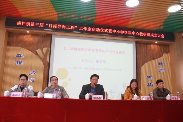 中山市督學、橫欄鎮教育和體育事務中心主任霍嘉俊在大會上作了講話,對榮獲橫欄鎮第三屆名校長、名教師、名德育干部、名班主任和學科帶頭人榮譽稱號的各位校長和老師們表示熱烈的祝賀,肯定了大家為橫欄教育事業的快速發展所作出的貢獻。他給主持人們提出了“四要”建議:一是要樹立堅定的教育教學信仰,不斷提升個人的專業素養;二是要珍惜機會,抓住機遇,提升自我,爭取“實至名歸”;三是要充分展示自己的教育智慧、教學水平,在更大的范圍內、在更深的層次上發揮好示范、帶動作用;四是要做規范辦學、推進素質教育的典范,做教育教學改革、教育教學創新的探索者。借此機會,霍嘉俊也轉達了橫欄鎮副鎮長蔡榮輝的祝福和寄語,希望大家充分利用好工作室這個發展平臺,提升自己的專業素養,進一步錘煉和積淀個人的教學智慧,努力在課堂教學領域研有所成,不斷提升個人的教學水平和科研能力,為促進橫欄鎮教育發展作出應有的努力和貢獻。
