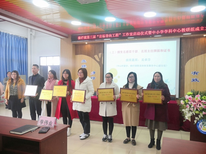 在熱烈的掌聲中,橫欄鎮教育和體育事務中心專干楊慧才為王欣等學科帶頭人頒發了榮譽證書;中山市督學、橫欄鎮教育和體育事務中心副主任吳卓芬為陳冬華等名德育干部、龔云丹等名班主任頒發了牌匾和榮譽證書;中山市督學、橫欄鎮教育和體育事務中心主任霍嘉俊為名校長歐慧芳、王春明等名教師頒發了牌匾和榮譽證書。手捧牌匾和證書,老師們的臉上露出了自豪、幸福的笑容。