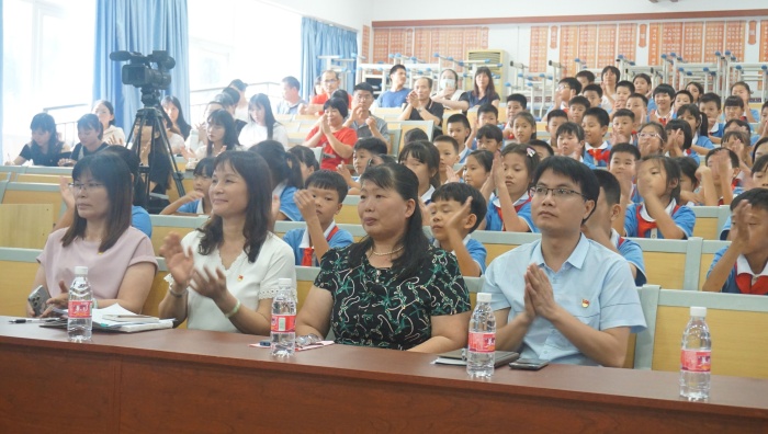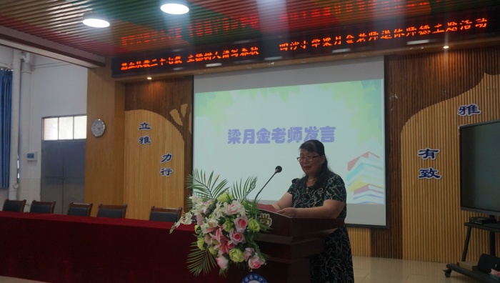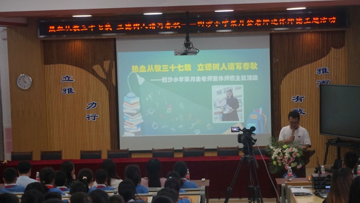 為弘揚(yáng)人民教師教書育人的高尚品格,進(jìn)一步提升教師的幸福感,增強(qiáng)教師的使命感和責(zé)任感,激發(fā)學(xué)生尊師之情,2022年7月1日下午,四沙小學(xué)舉行了“熱血從教三十七載 立德樹人譜寫春秋”梁月金老師退休師德主題活動(dòng)。活動(dòng)主會(huì)場(chǎng)在階梯室,其他班級(jí)通過(guò)釘釘直播收看。